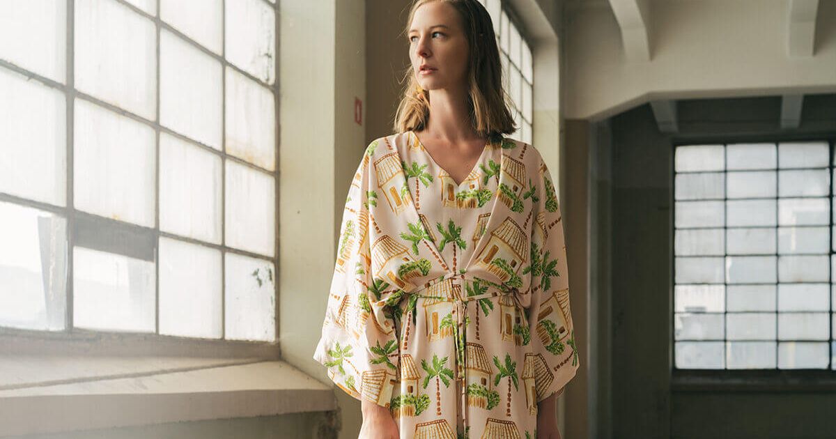 V kolekciji ALMA se prepleta tradicija s sodobnim oblikovanjem. Želela sem narediti povsem avtorsko zgodbo. Alma je nastajala miselno kar nekaj časa in sedaj vidim, da je to bilo tudi potrebno. Ko sem počasi vizualizirala svojo idejo o kolekciji, sem videla, da bo nujno potrebno izdelati avtorske vzorce (hiške, pahljače…). Glavne podobe in elemente sem črpala iz zbirke Alminih razglednic (bojda jih je bilo preko 1000!) ter iz Alminih risb iz skicirk. V sodelovanju z ukrajinsko umetnico in ilustratorko sva skupaj razvili te unikatne vzorce, v stilu akvarelne risbe. Prevladuje vzorec tropske hiške, lahko bi pa bila tudi panonska 😊, ter vzorec pahljače, tudi teh je v zbirki precej in so imele pri Almi poseben status. Skupaj z vodilnim kosom kolekcije, tj. kimono obleka. Prav z odločitvijo za kimono nekako zajemam ta duh Azije, ki tudi mene vsakič znova prevzame. Tukaj vidim spet veliko povezanost, tudi sama bi verjetno izbrala podobne suvenirje, kot sta kimono in pahljača, in potem si rečem spet, kakšna »asica« je bila ta Alma.